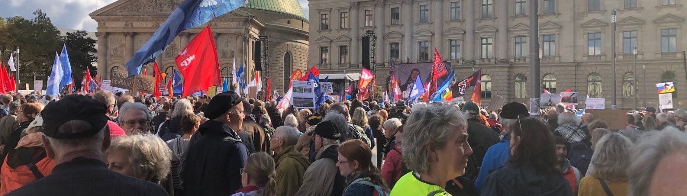 Zu den Großdemonstrationen „Nie wieder kriegstüchtig! Stoppt den Völkermord in Gaza! Stoppt den Krieg in der Ukraine!“ am 3. Oktober kamen – nach ersten Angaben der Veranstalter – in Berlin über 20.000 Menschen und in Stuttgart circa 15.000 Menschen.